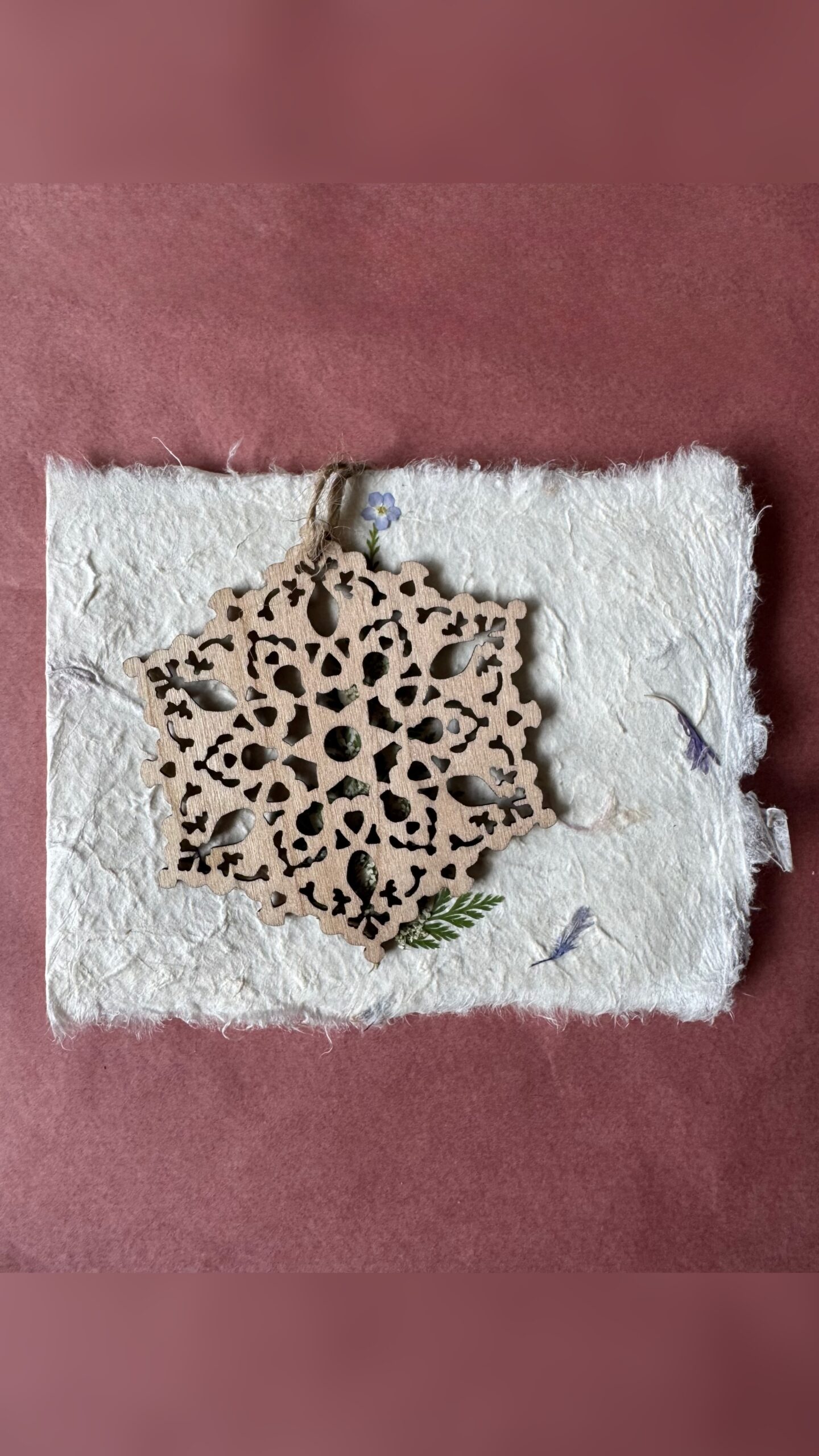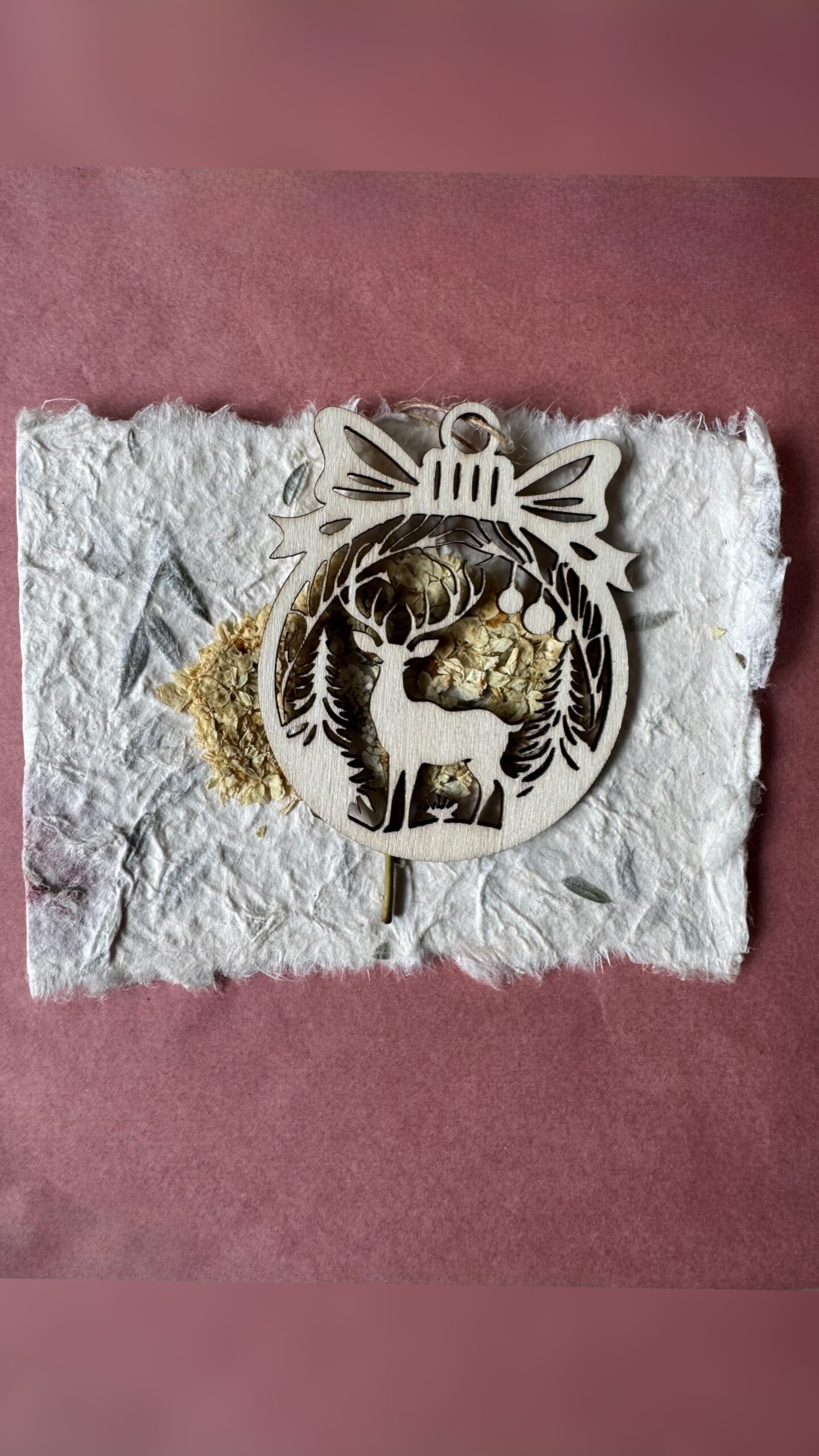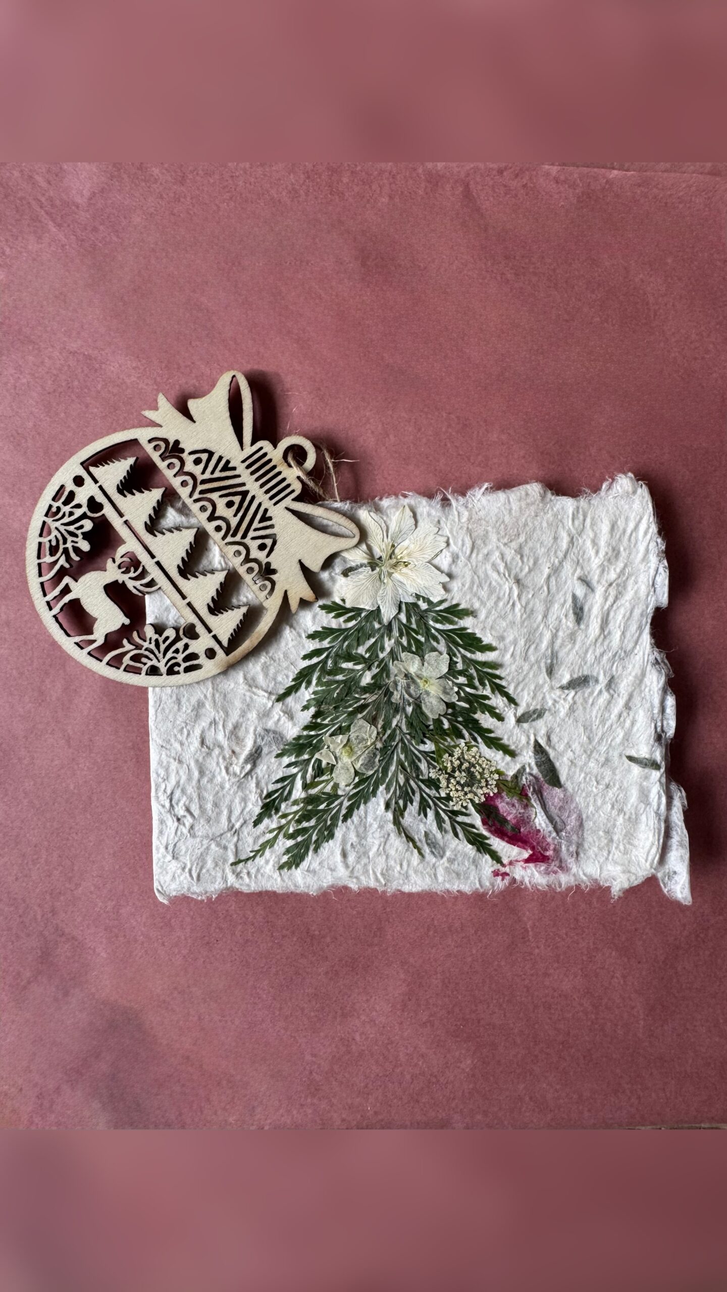 Iga kaart on loodud armastusega käsitööna – valmistatud naturaalsest käsitööpaberist, kaunistatud ehtsate kuivlillede ja väikese puidust jõulukaunistusega, mida saab hiljem riputada jõulupuule.