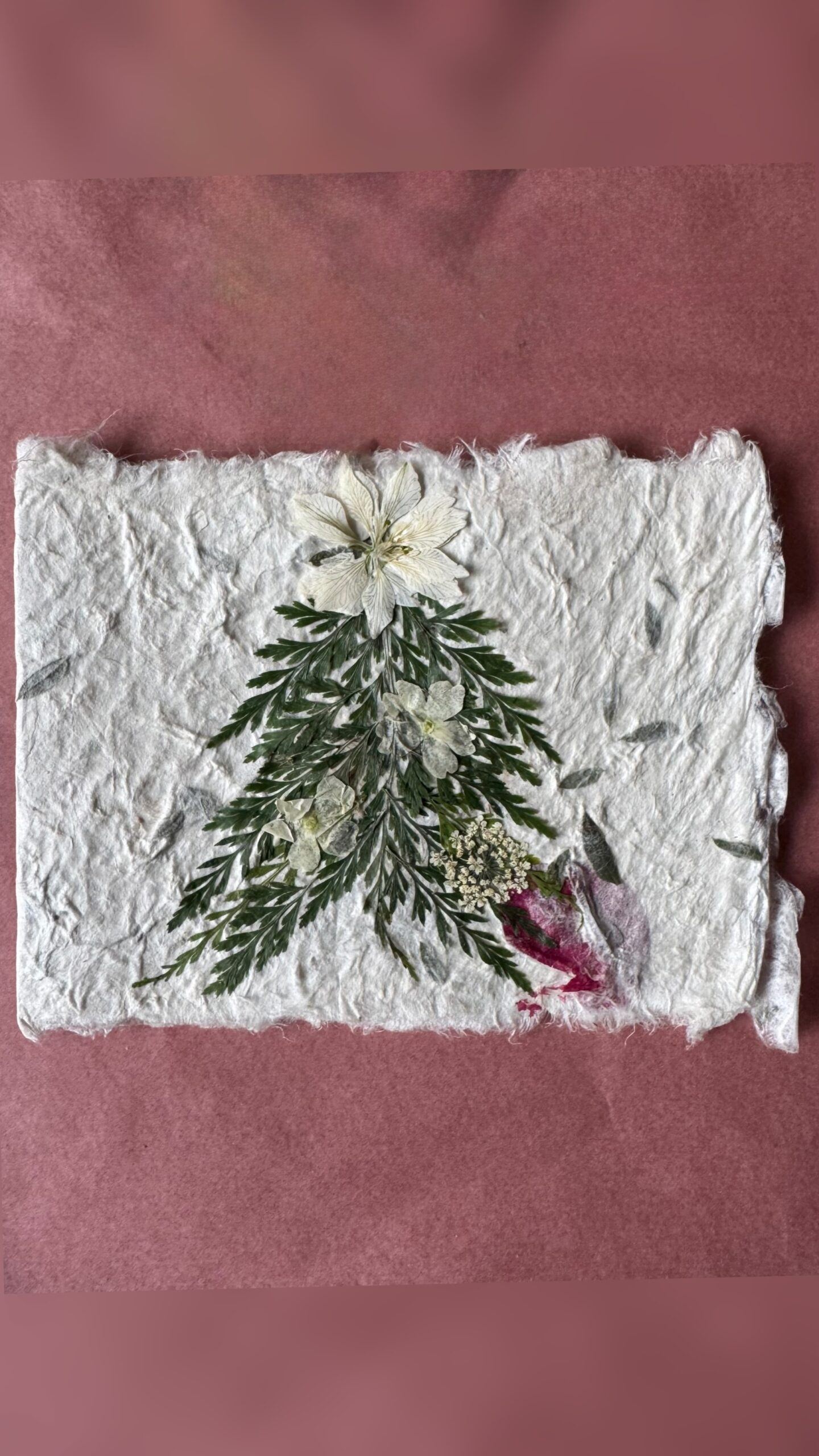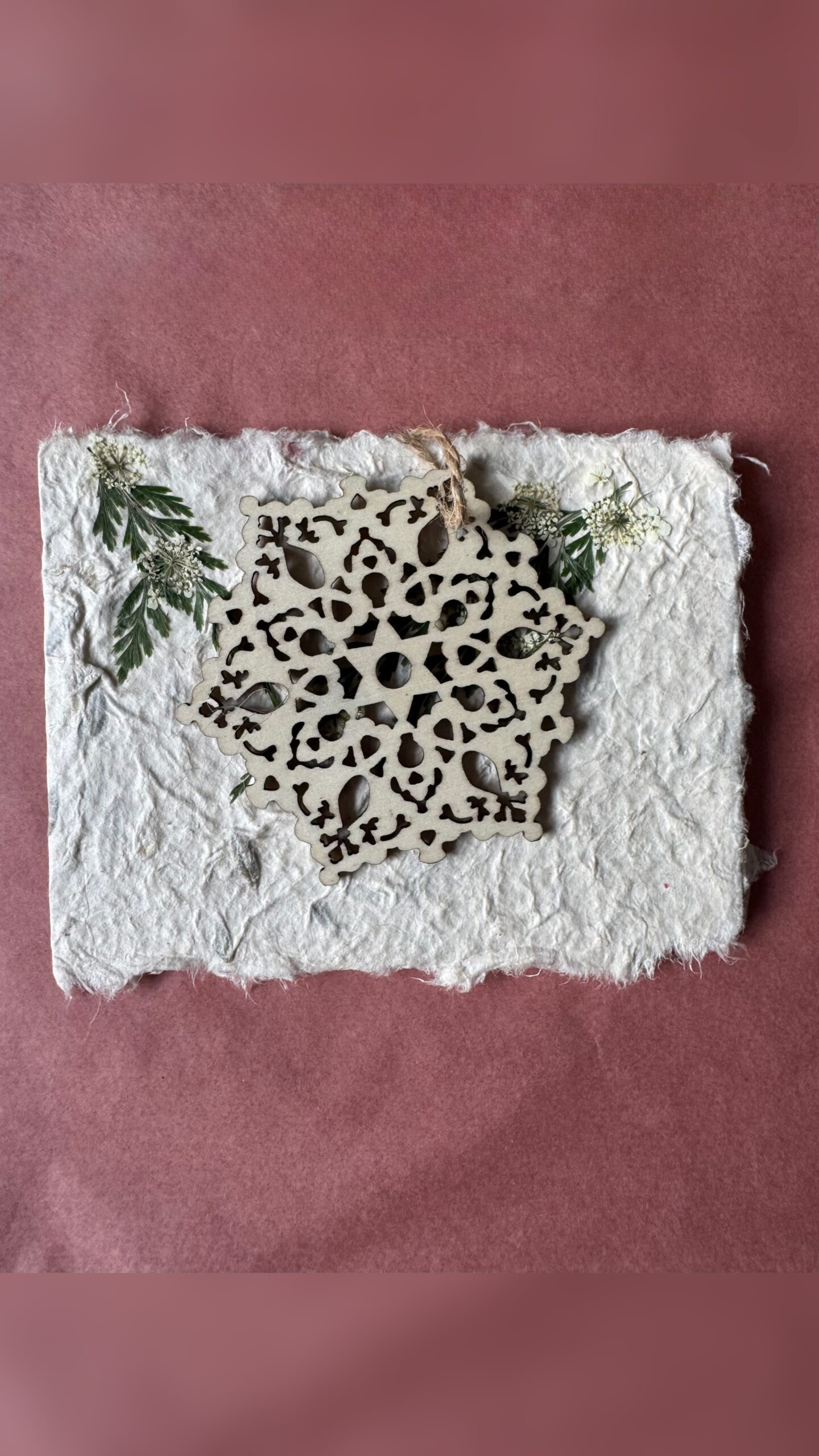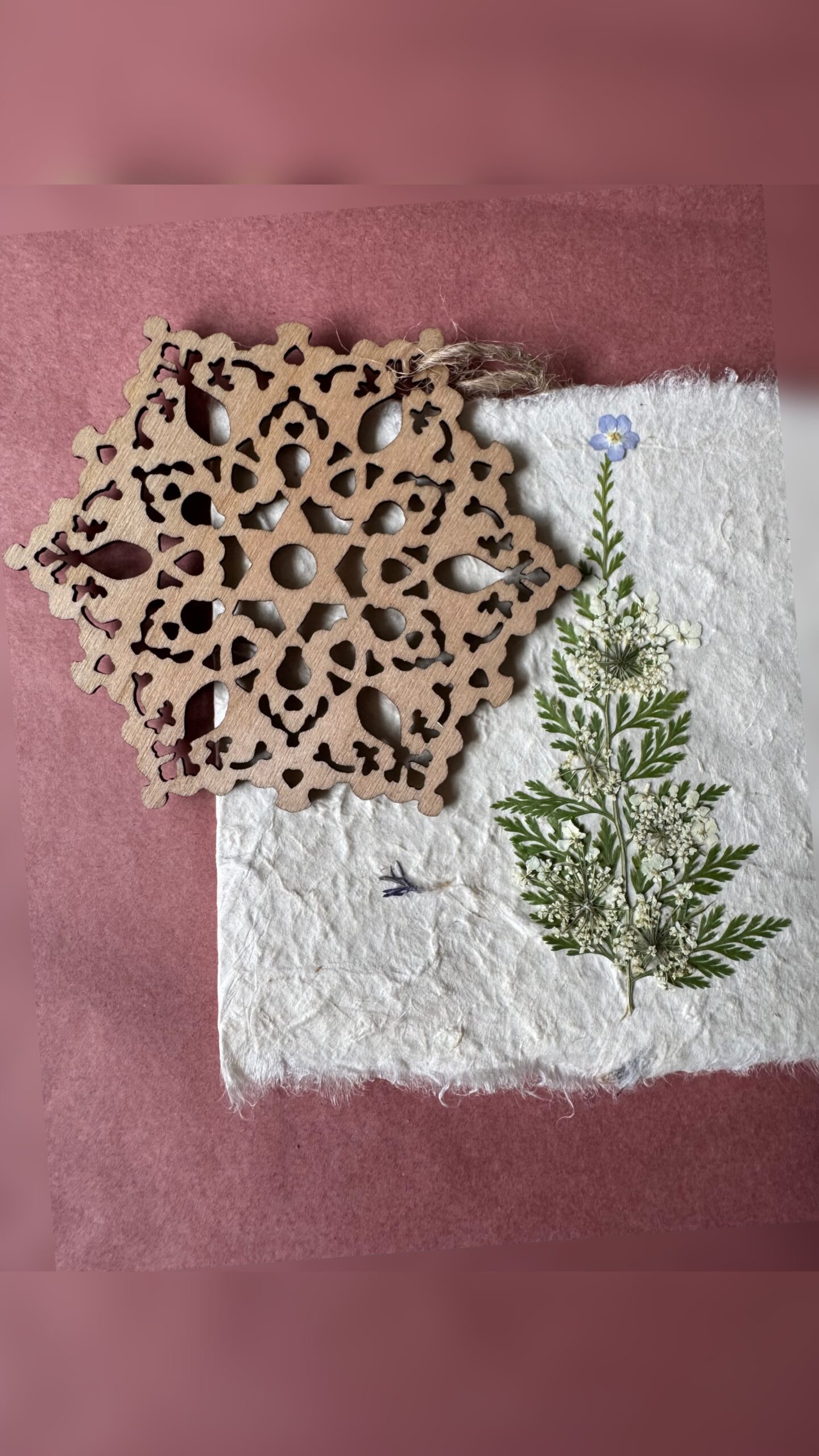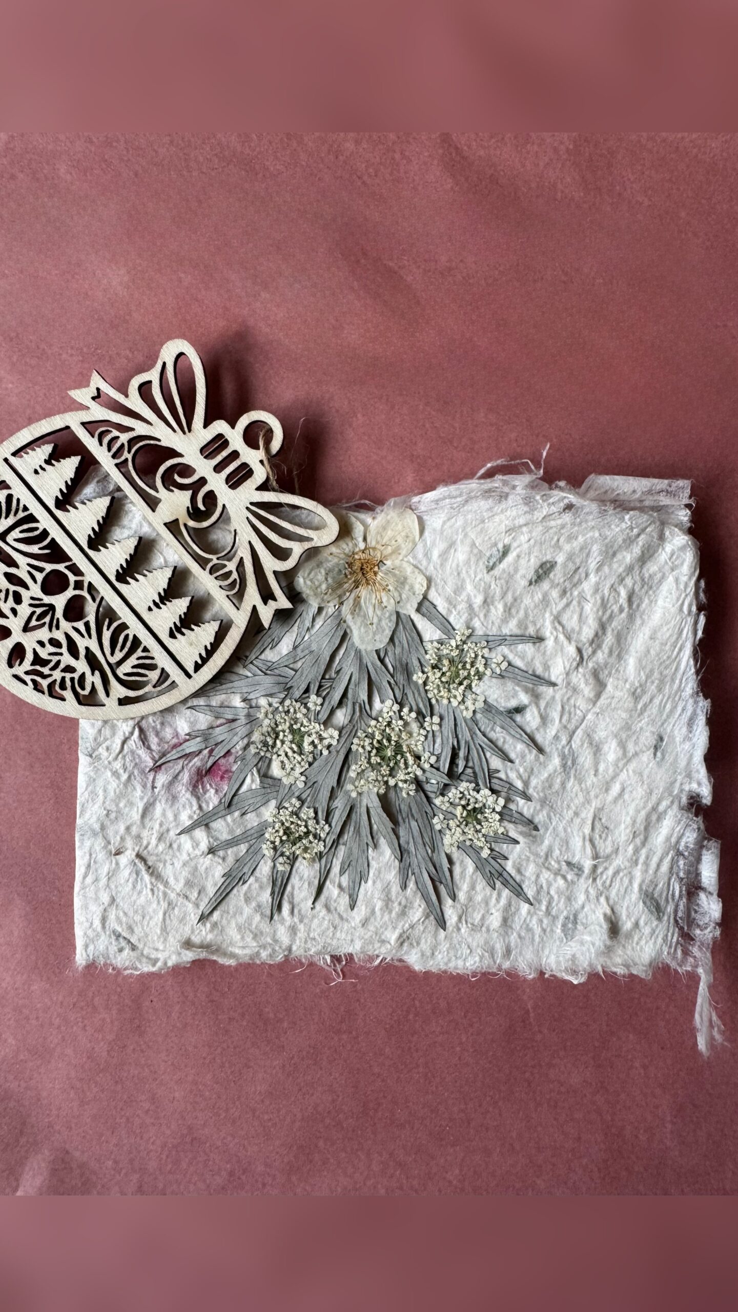 Iga kaart on loodud armastusega käsitööna – valmistatud naturaalsest käsitööpaberist, kaunistatud ehtsate kuivlillede ja väikese puidust jõulukaunistusega, mida saab hiljem riputada jõulupuule.
