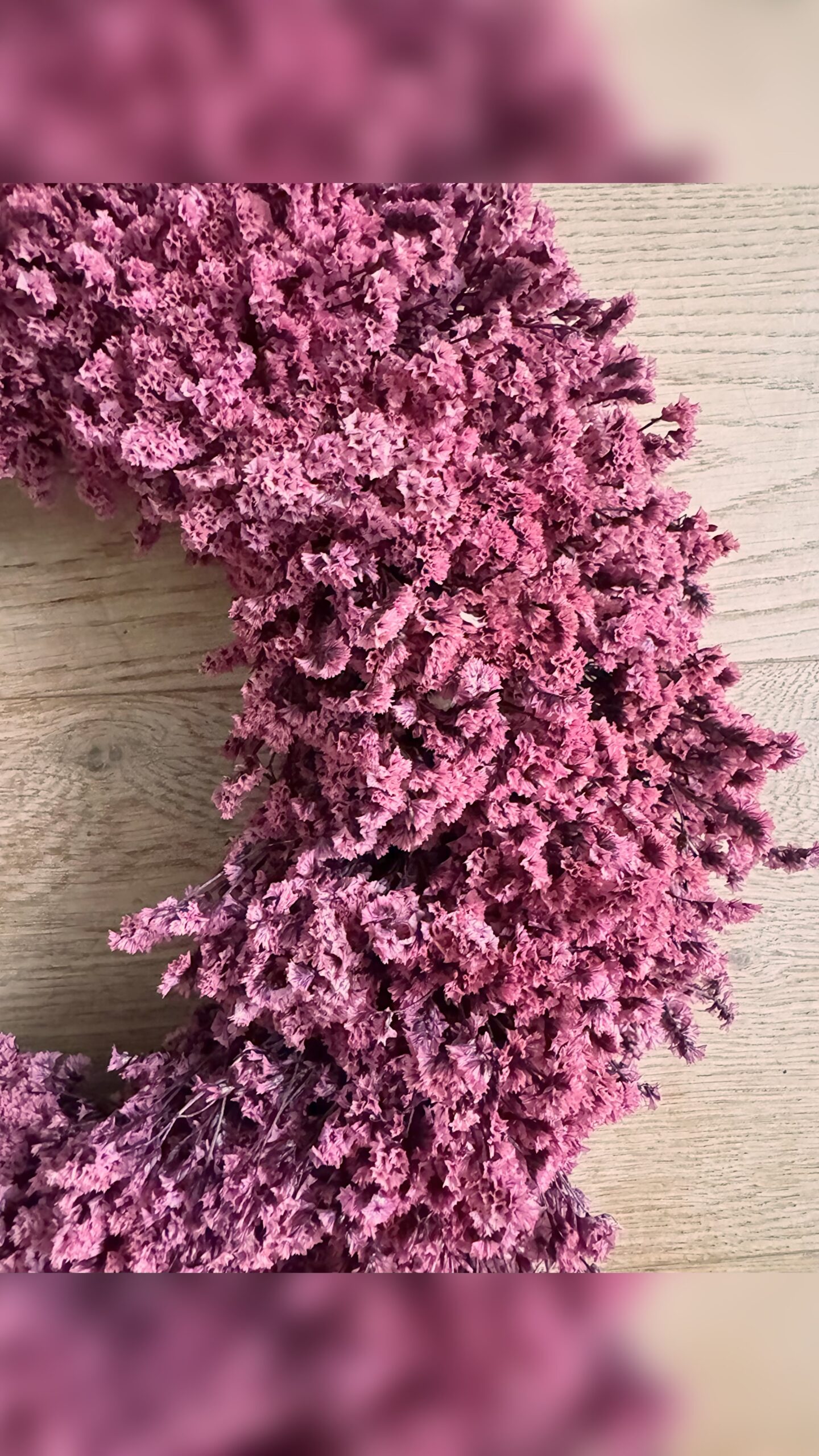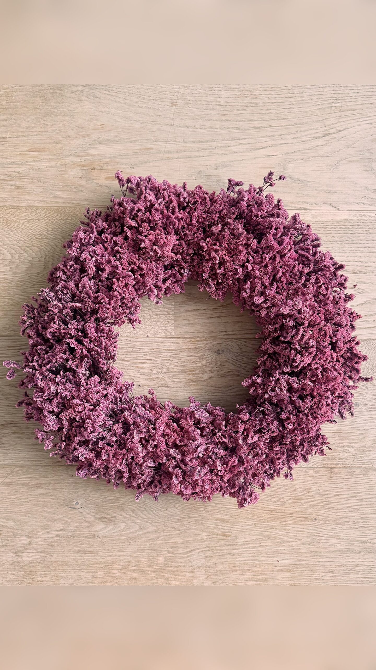 Käsitsi loodud pärg sügavas roosakas-lillakas toonis. Tihe ja terviklik vorm, mis loob tunde soojusest, kohalolust ja vaiksest jõust.
